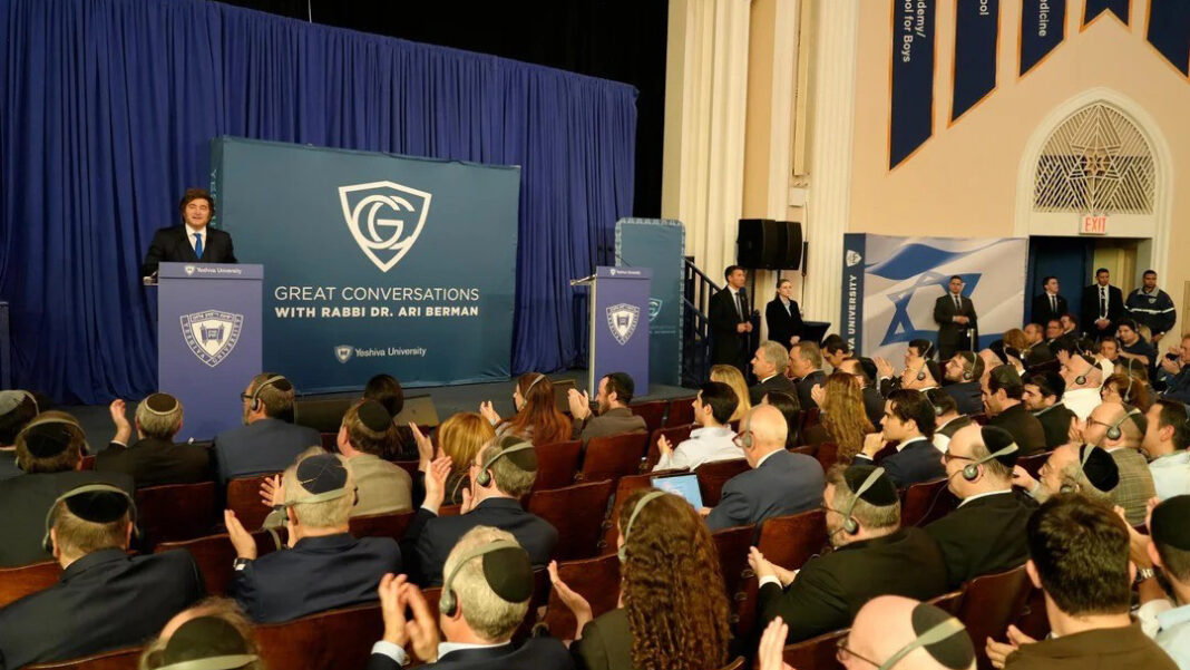 “Nos han metido dos bombas, una en la AMIA y otra en la Embajada de Israel. Por lo tanto, digamos, son nuestros enemigos. Además tengo una alianza estratégica con Estados Unidos e Israel», expresó Milei, en la frase más relevante de su exposición que contó la presentación del rabino Ari Berman, rector de la Universidad.